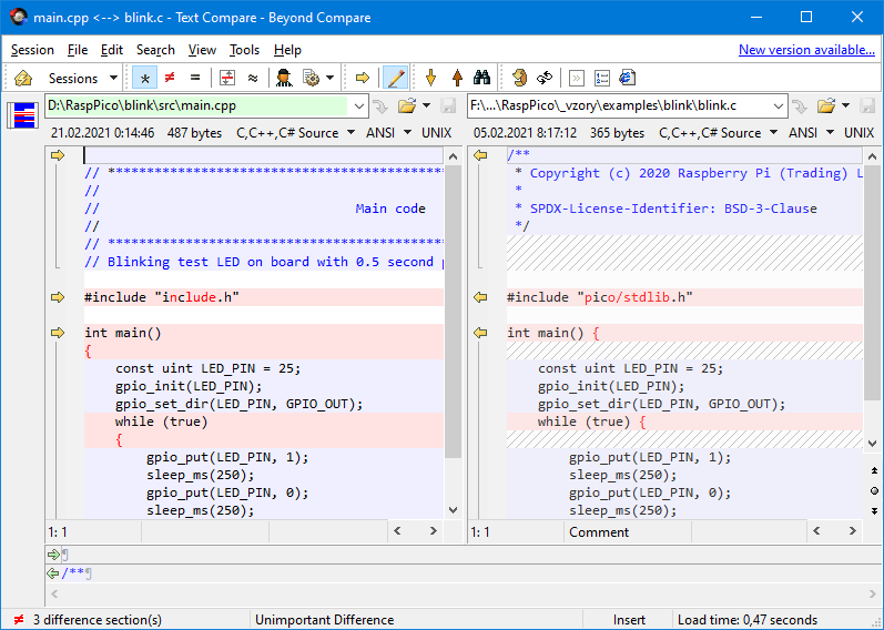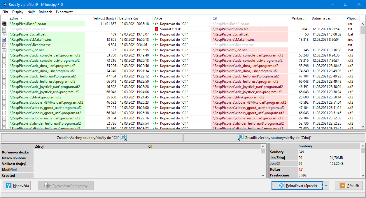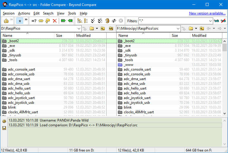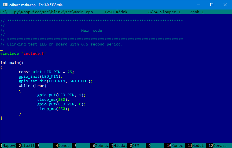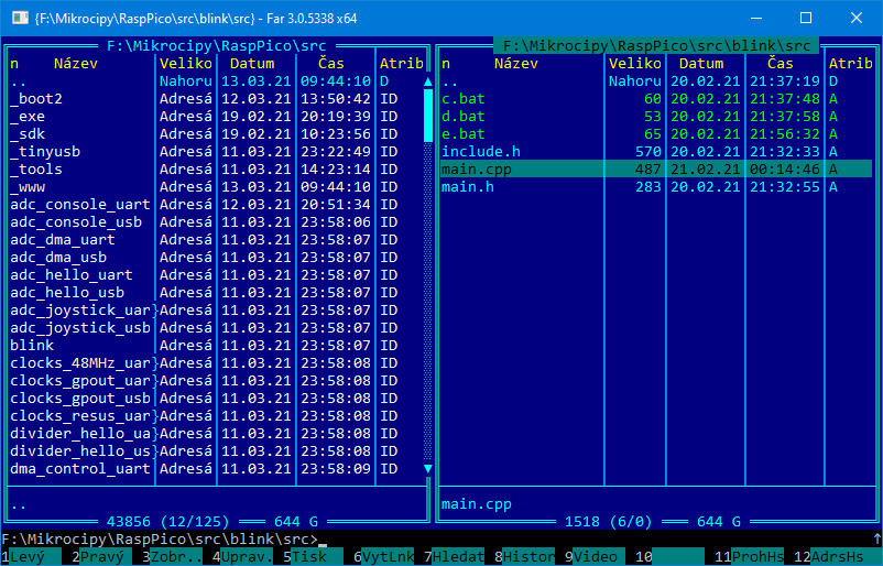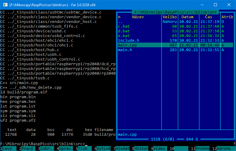 All demo examples in RaspPicoSDK are already prepared pre-compiled (the compiled file is always named program.uf2). Just upload them to Pico by running e.bat (="Export"). If you want to change something in the code, run c.bat (="Compile") to get new compilation. In FAR just press c<Enter>. To clean up compilation, run d.bat (="Delete"). All compiled temporary files will be deleted, leaving only the resulting compiled program.uf2 file.