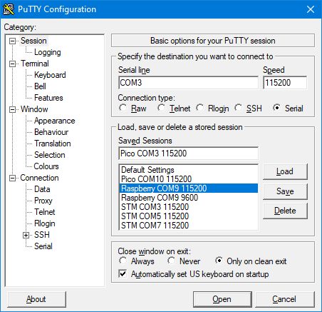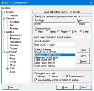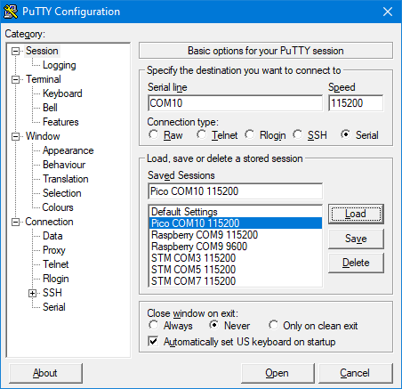 A very useful feature when working with the Raspberry Pico is a console program for communication via the serial port. I use the program begPuTTY, download begPutty.zip. Home page http://qww.cz/Ctrl-Home-and-Shift-Arrows-in-Putty-Linux.html , this is a modification of the PuTTY program https://www.chiark.greenend.org.uk/~sgtatham/putty/ . (note: To copy a text from console window to the clipboard, just select the text with the mouse)