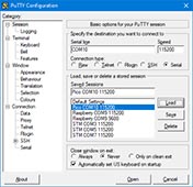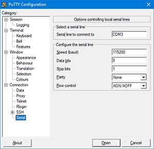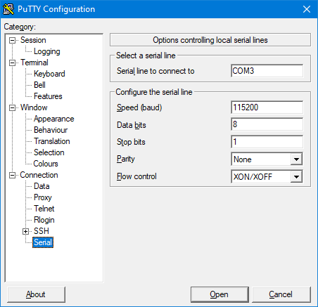 Enter the detected COM port number in the begPuTTY settings. Select baud rate 115200, connection type Serial. In the Connection / Serial setting, set 8 bits, 1 stop bit, no parity, XON/XOFF flow control. In the Terminal settings, enable the "Implicit CR in every LF" option.