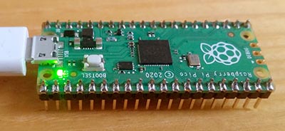 To use the Raspberry Pico for the first time, you need nothing more than an USB cable to connect Pico to the PC. To upload a new program to the Pico, disconnect the USB cable, press and hold the BOOTSEL button on the Pico, connect USB cable, and release the button. A new 127 MB disk, labeled RPI-RP2, appears in the list of disks.