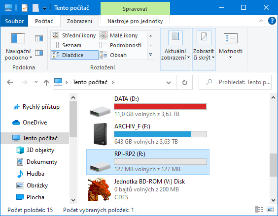 Now you can just drag the new program to this new disk. Of course, the console programmer does not linger with the mouse :-) and uses a simpler method - sending program to the disk with the e.bat command file. For this purpose, it is useful to name the disk uniformly, eg R: (= Raspberry). Renaming is done in computer management - via My Computer / Manage. Or, edit the disk name in the _e1.bat file.