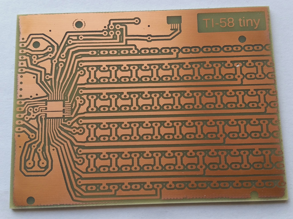 plošný spoj (okraje se mi podleptaly, protože mají slabší vrstvu fotorezistu, bylo nutné "dodrátování"):