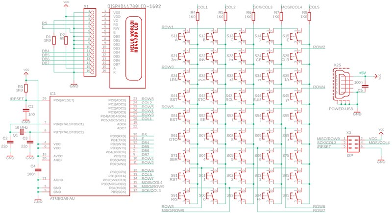 Konektor USB je využit pouze k napájení kalkulačky +5V. Odpory R4 až R8 nejsou nutné, výstupy COLx se přepínají mezi stavy LOW a 3D, nehrozí tedy zkrat mezi nimi. Krystal lze vypustit a namísto něj využít interní RC oscilátor 8 MHz, rychlost kalkulátoru bude i tak značná (pracuje podstatně rychleji než původní kalkulátor).