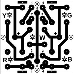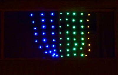 Software: The unit is controlled by a jumper and a DIL switch. The jumper determines whether one of the 14 programs selected on the DIL switch is used or whether the automatic mode of alternating all programs is used. The program contains the resulting "image" in the Img field, which is a sequence of LEDs with a row-column-5 LED organization. Animation routines populate the array with the desired color pattern, and interrupts from the timer then periodically transmit this array to the LEDs with appropriate remapping to serial data. The processor has fuses set high=0xc1, low=0x1f.