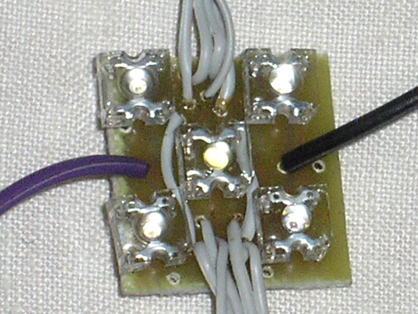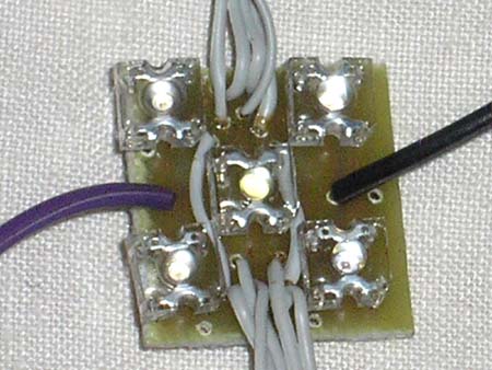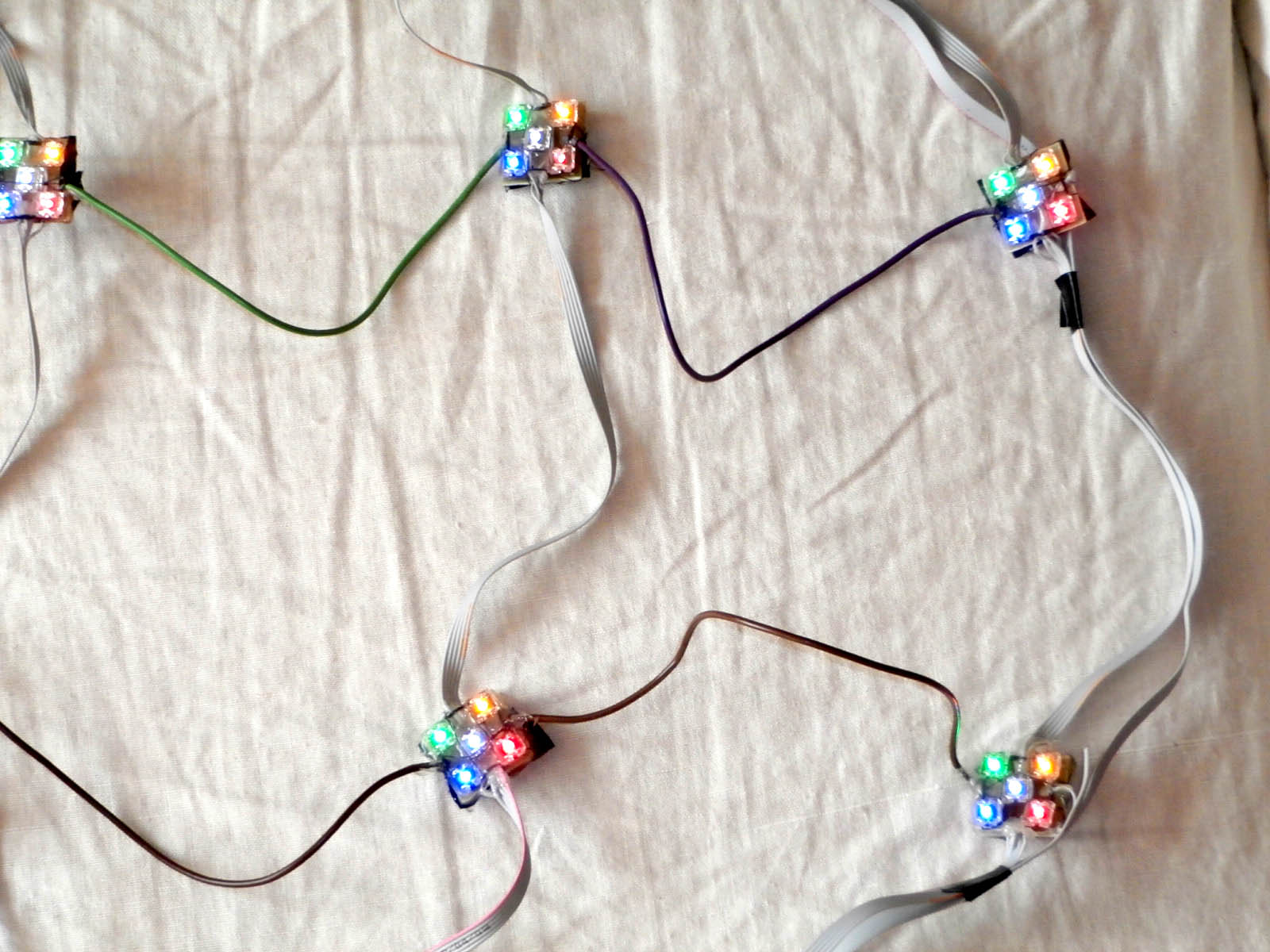 Connecting to the net: The segments are connected in an 8x8 matrix. Horizontally it is 1 wire (multiplex row - it is fed by the outermost 8-core cable) and vertically 5 wires (2 columns are connected to each connector). Note in the previous picture that most of the wires run through the segment using conductive contacts in the LED, but the 2 vertical wires need to be connected with wire jumpers. Choose better wires than I have chosen. They are too thick, inflexible, the netting is then hard to place on the tree (it twists on its own), plus the light colored wires are a bit visible on the tree, especially the grey multi-core ones.