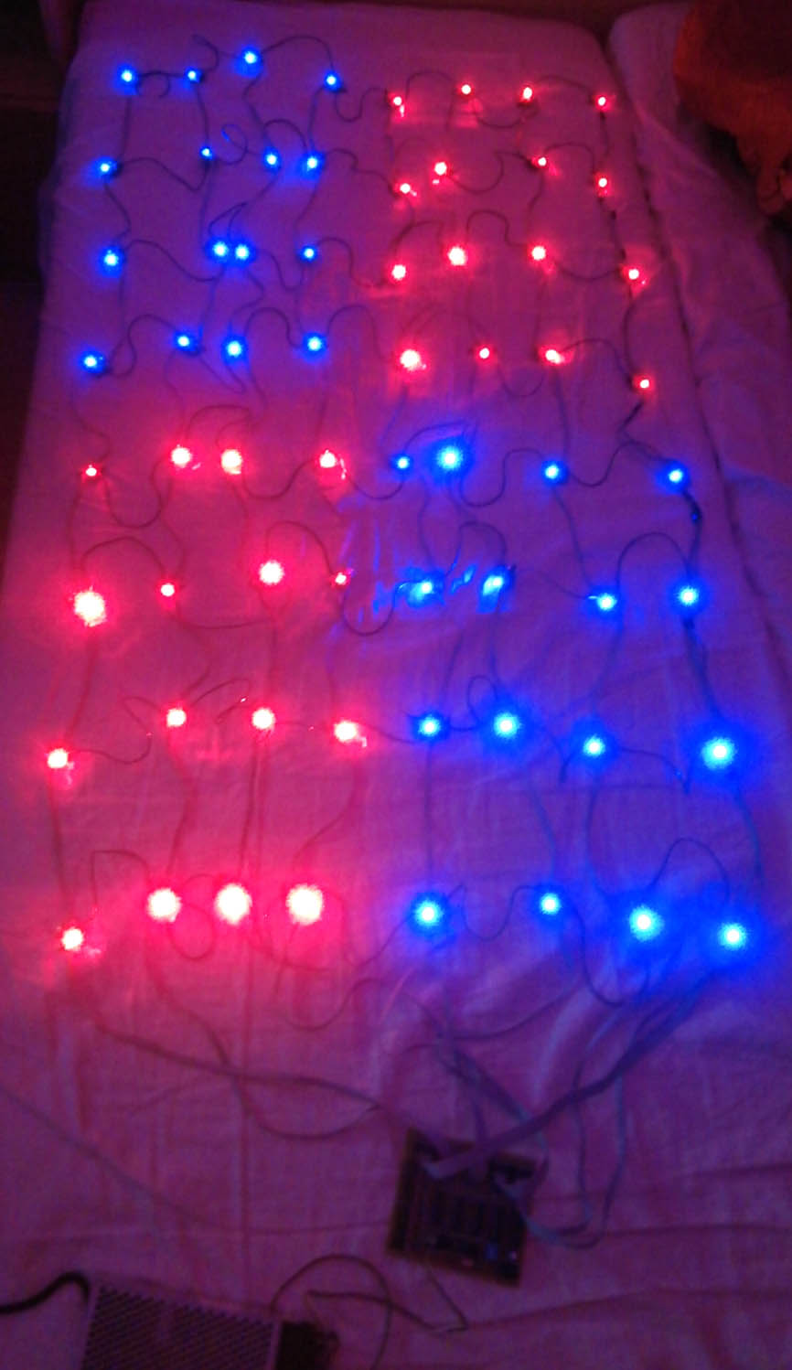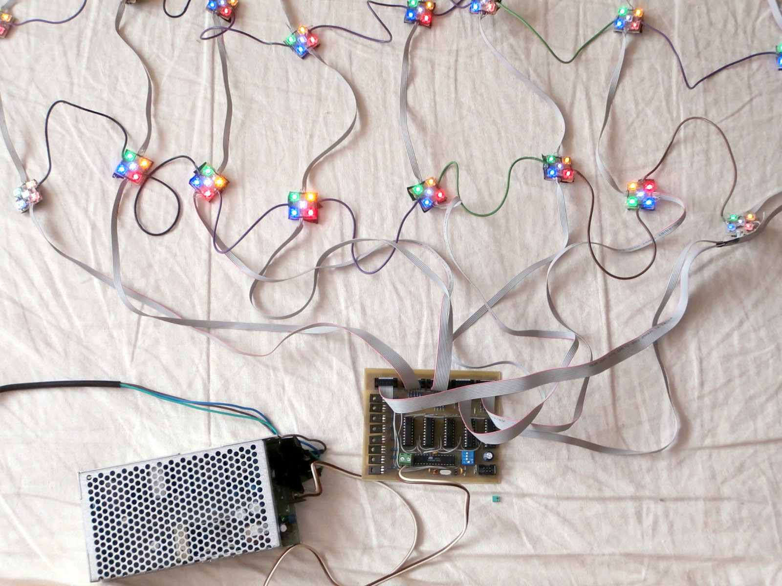 Since I wanted to play around with microchip programming a year ago, I had the idea to create some interesting blinks for my family's Christmas tree. The result was a central control unit with an ATmega8 processor, eight BD682 transistors and five TPIC6B595N shift registers that fed a multiplexed net of 8x8 segments of 5 colored LEDs each.