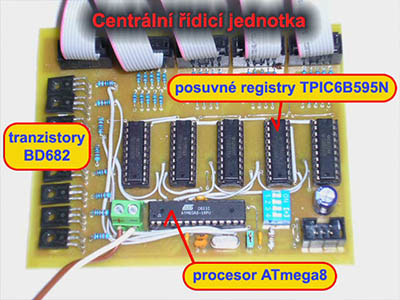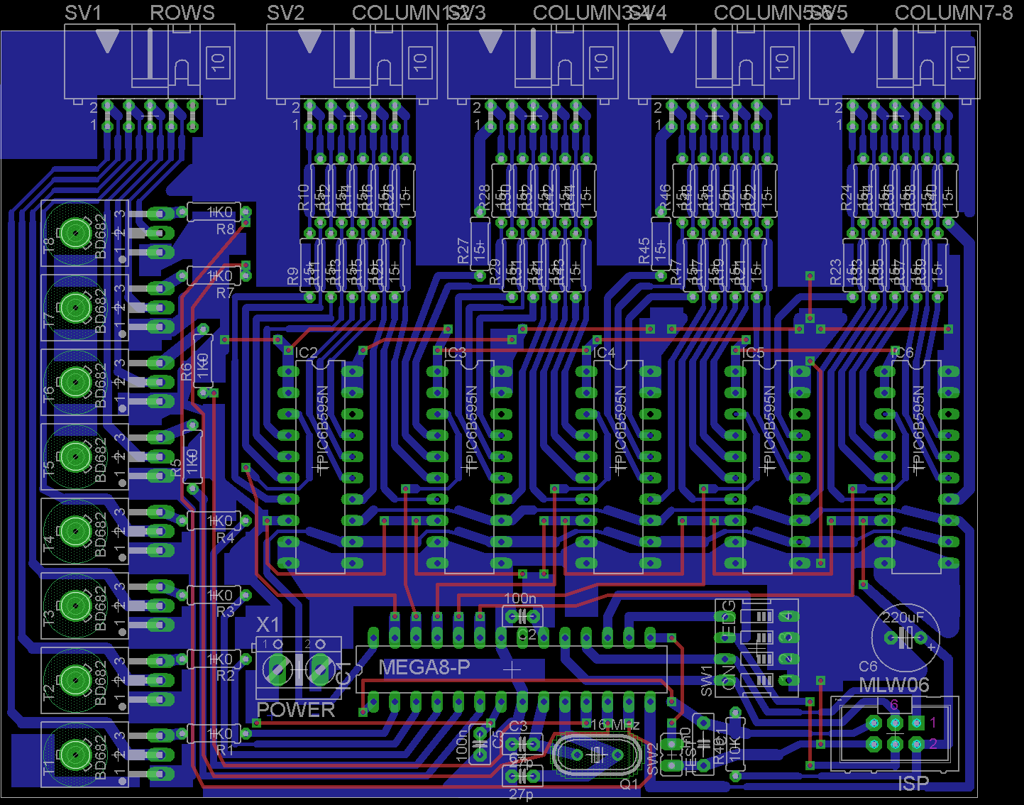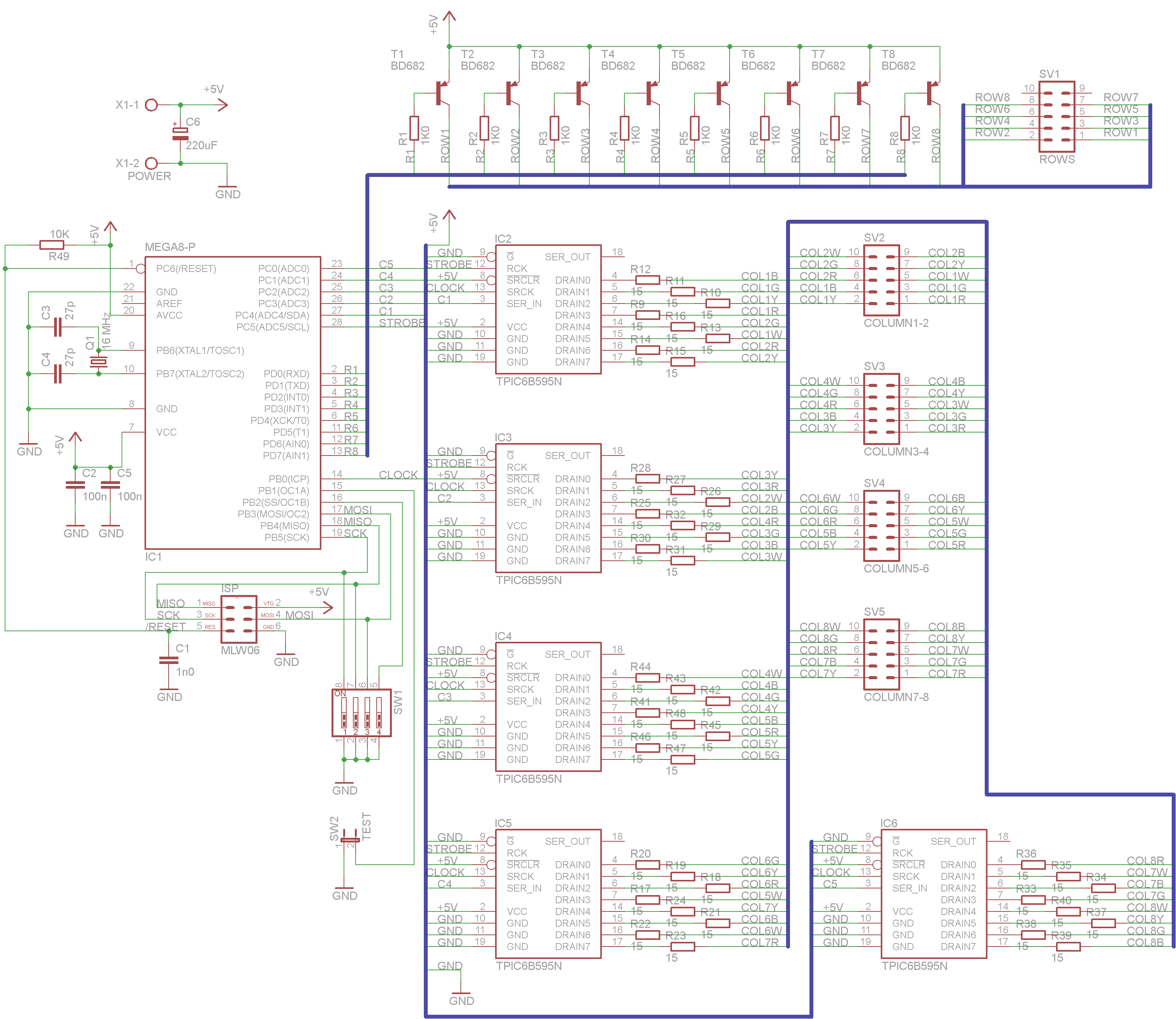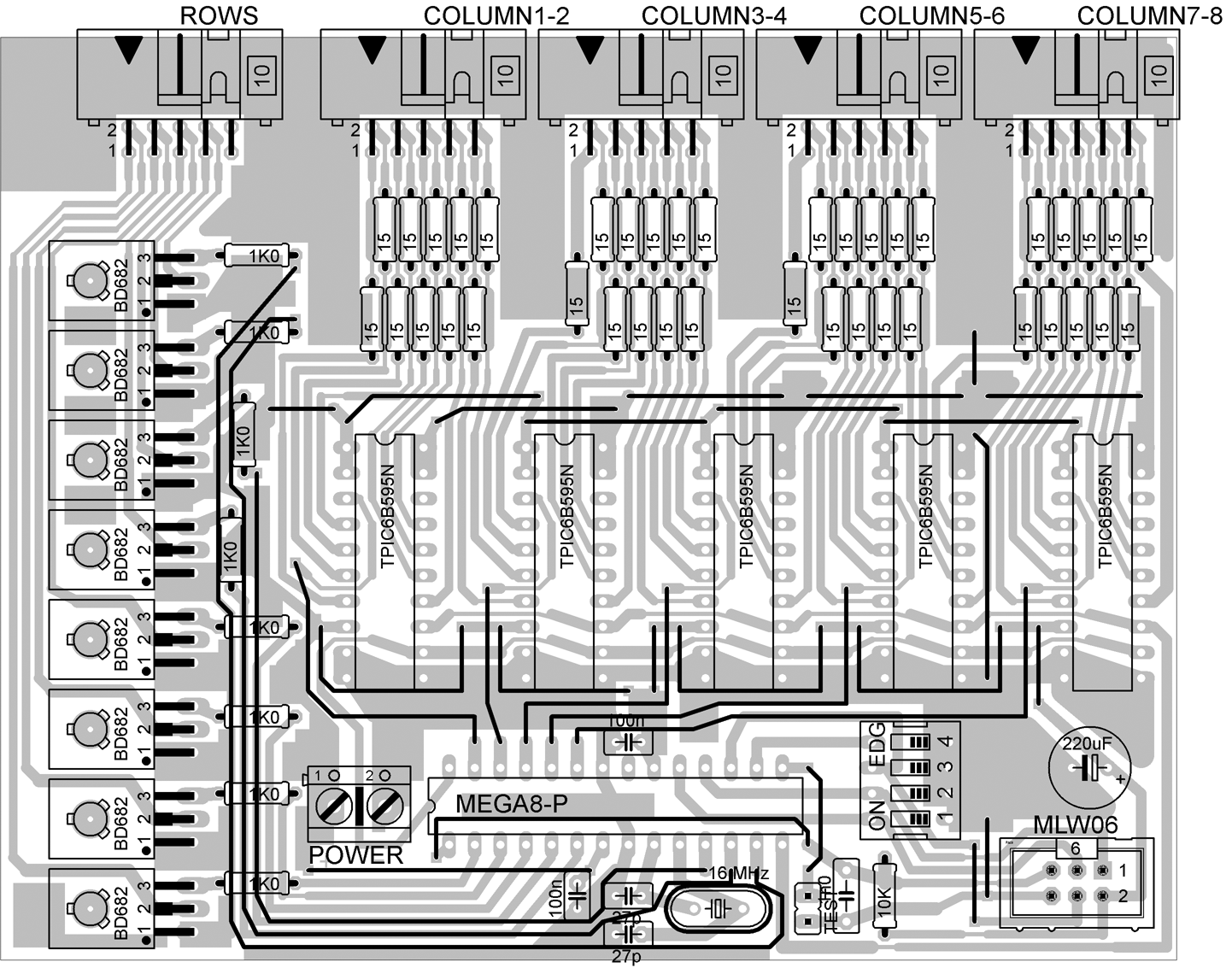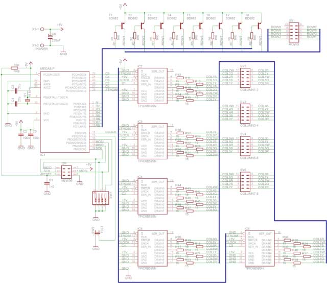 Wiring diagram: The heart of the controller is an ATmega8 processor with a 16 MHz crystal. It directly switches the 8x BD682 row excitation transistors and sends serial data to five TPIC6B595N shift registers, which switch the LED columns. The shift registers have open-collector DMOS switching transistors at the output and are capable of switching current up to 150 mA (500 mA pulsed), so they are well suited for multiplexing. If you replace them with e.g. TPIC6C595N, you need to change the PCB (they have differently placed pins) in addition to the current limitation.